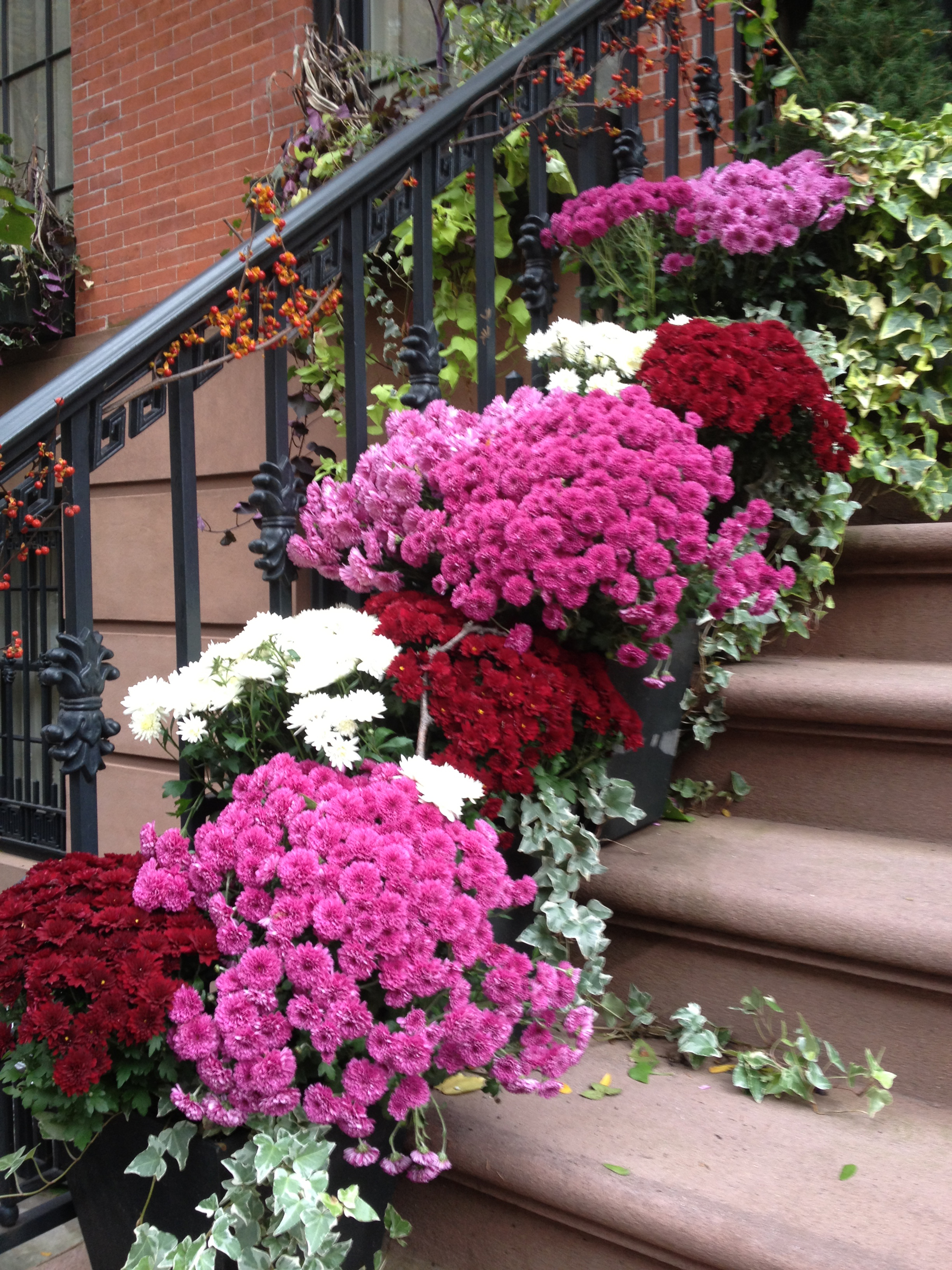 My coordination of chrysanthemum colors was nearly complete. I was satisfied that as Greg and Stephanie or Greg then Stephanie or Stephanie then Greg stomped down the stone stairs in a few moments they would pass by a perfect cascade of fall colors.